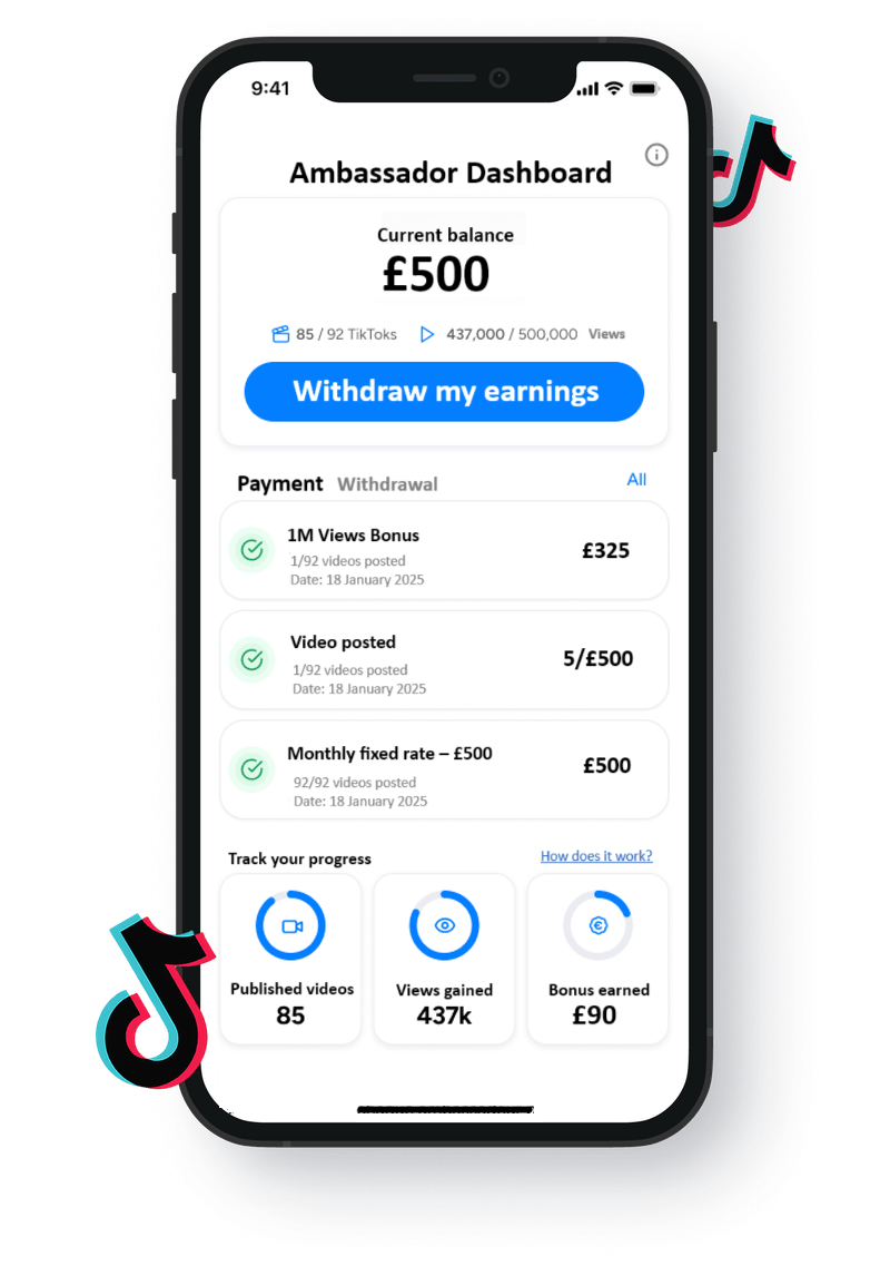 You get paid every month if you reach the goals. For example, if you post 92 videos in a month and reach 500,000 views, you automatically receive £500. Then, you earn additional commissions based on extra views. Payments are made by bank transfer.